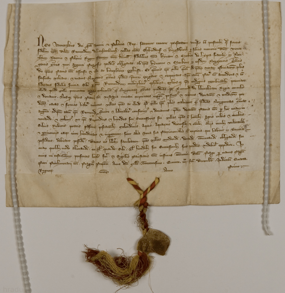 Mladičký král Václav III. potvrzuje Rajmundovi z Lichtenburka a jeho dědicům svobodné držení velmi bohaté a výnosné vsi Černilov (Slakendorf) a Jasenná (Hengstberch), ležící uprostřed Hradecka, spolu s lidmi, obdělávanými a neobdělávanými poli, lesy, křovinatými stráněmi, loukami, pastvinami, rybníky, mlýny, vodními plochami a toky spolu s dalšími právy k věčnému užívání (cum hominibus, agris cultis et incultis, siluis, rubetis, pratis, pascuis, piscacionibus, molendinis, aquis, aquarumue decursibus et omnibus aliis iuribus). Václav Rajmundovi majetky daroval, aby tím splatil dluh svého otce, českého a polského krále Václav II. (per d. Wencezlaum, Boemie et Pol. regem, patrem nostrum). Vsi do té doby byly zastavené bratřím Hynkovi a Čeněkovi z Lipé (Rajmunvodým bratrancům, vlastně synovcům) a jejich zástavní suma odpovídala 900 hřiven stříbra. Král vsi odkoupil a daroval Rajmundovi. Zároveň mu prominul rozdíl mezi hodnotou vsí a zástavní sumou s přihlédnutím k jeho věrným službám a s vědomím, že skutečná cena vesnic je daleko vyšší.