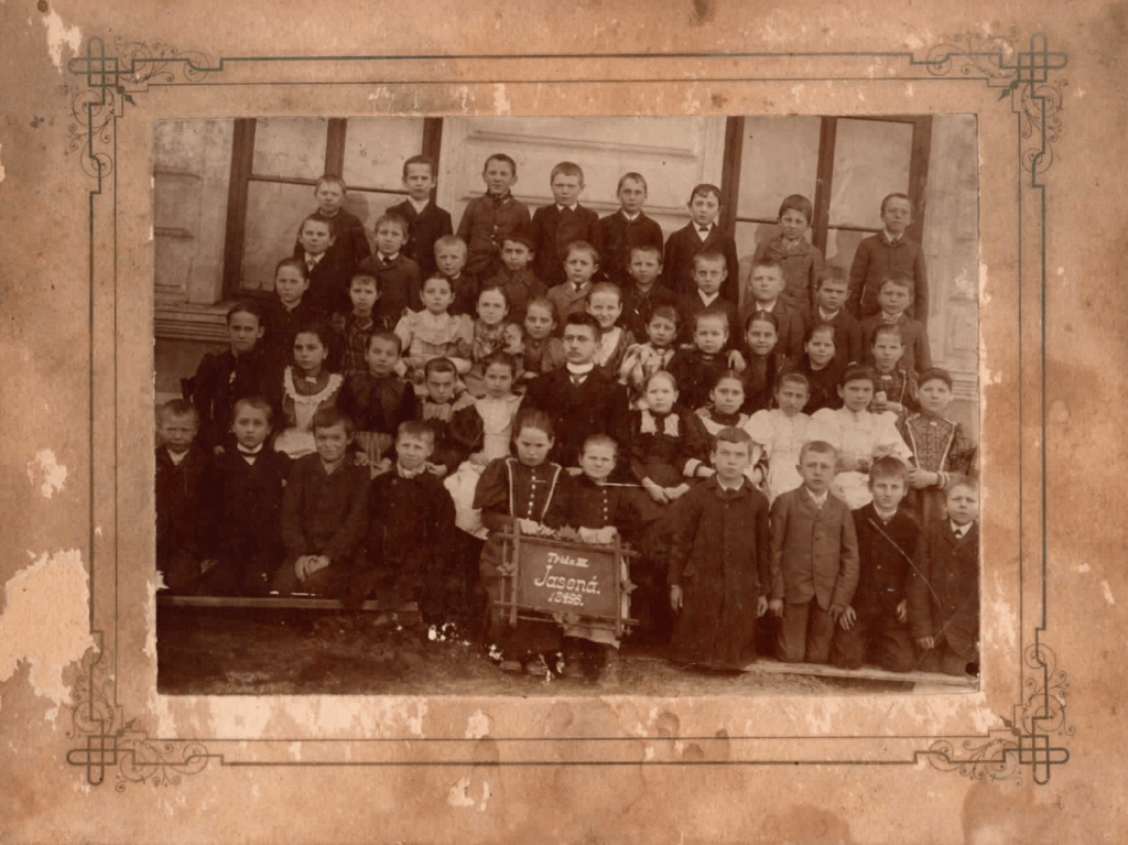 Děti stojí již před budovou nové školy, jejíž stavba byla dokončena v roce 1889. Ve škole tehdy působil jako řídící učitel Josef Mikeš (mezi lety 1895 až 1903). Škola byla čtyřtřídní smíšená a učilo se v ní dle učebních stanov z roku 1895. Ještě v roce 1892 navštěvovalo farní školu 215 žáků (počet žáků v roce 1900 činil 197). Jasenská škola byla ve sledovaném období jediná na celém tehdejším královédvorském okrese se čtyřmi definitivními postupnými třídami a osmi ročníky a obec platila za jednu z největších co do rozlohy a počtu obyvatel.