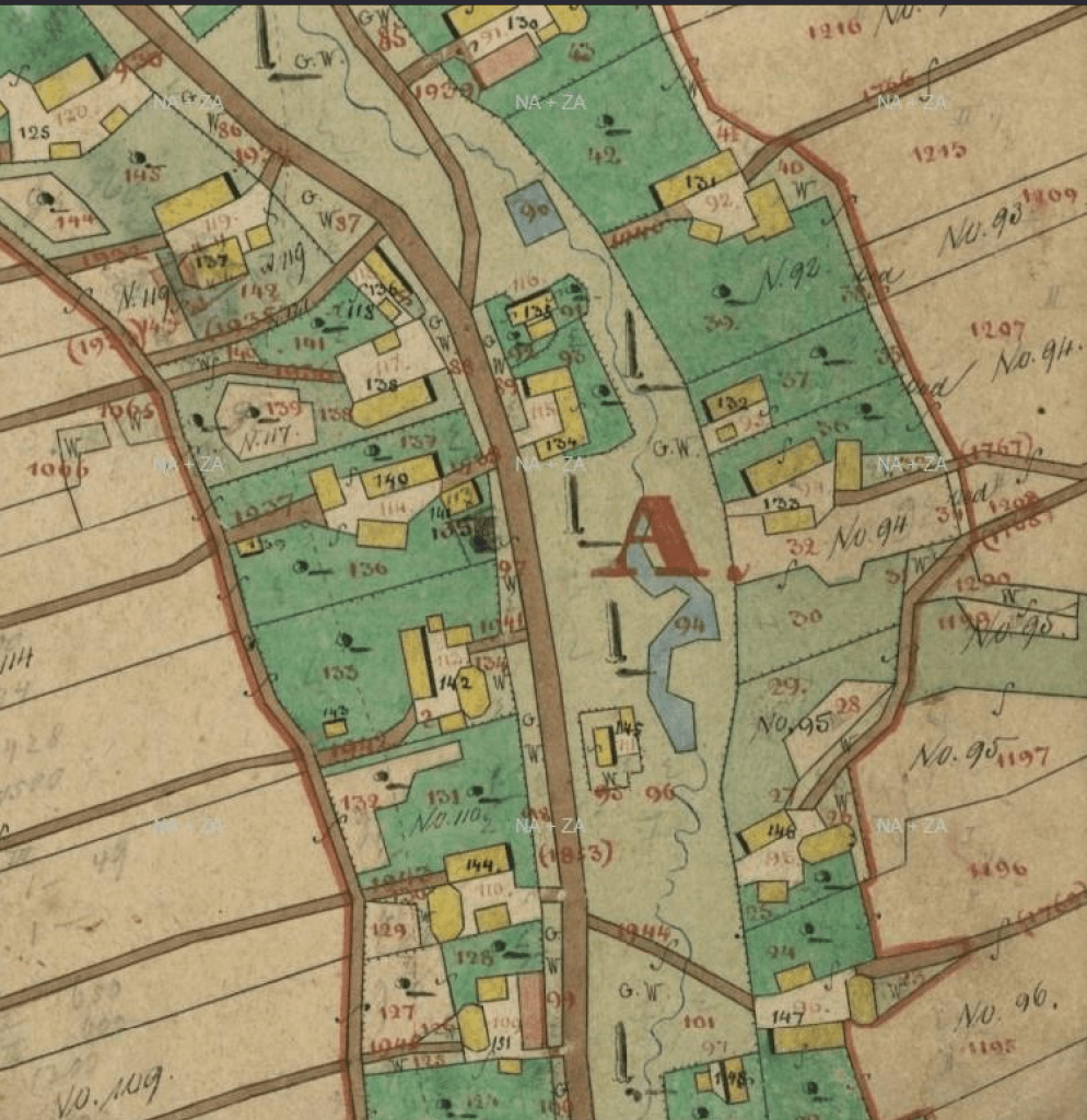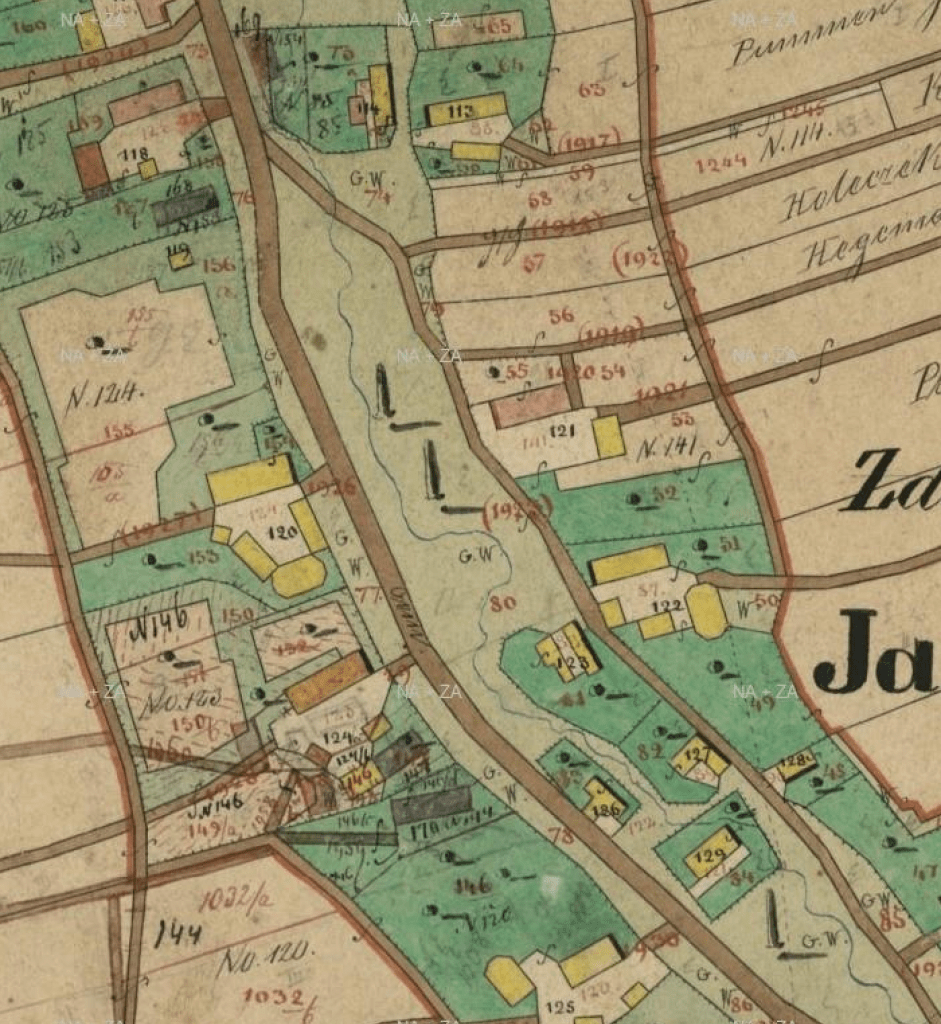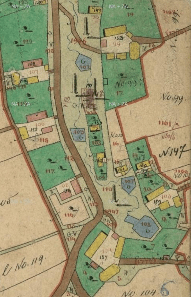 Podruhé se potok objevuje v roce 1840 na indikačních skicách. Zde je již rybníčků vyobrazeno 17. Rybníčky se nacházely na Horním konci u čp. 104, 147, 99, 102, 95 a 92. Trochu osamoceně stojí panský rybník Kobosák. Ve Středu obce se nacházelo sedm rybníčků, konkrétně u čp. 67, 49, 69, 5, 62, 60 a 21. Na dolním konci byly tři rybníčky u čp. 40, 35 a 29.