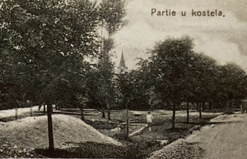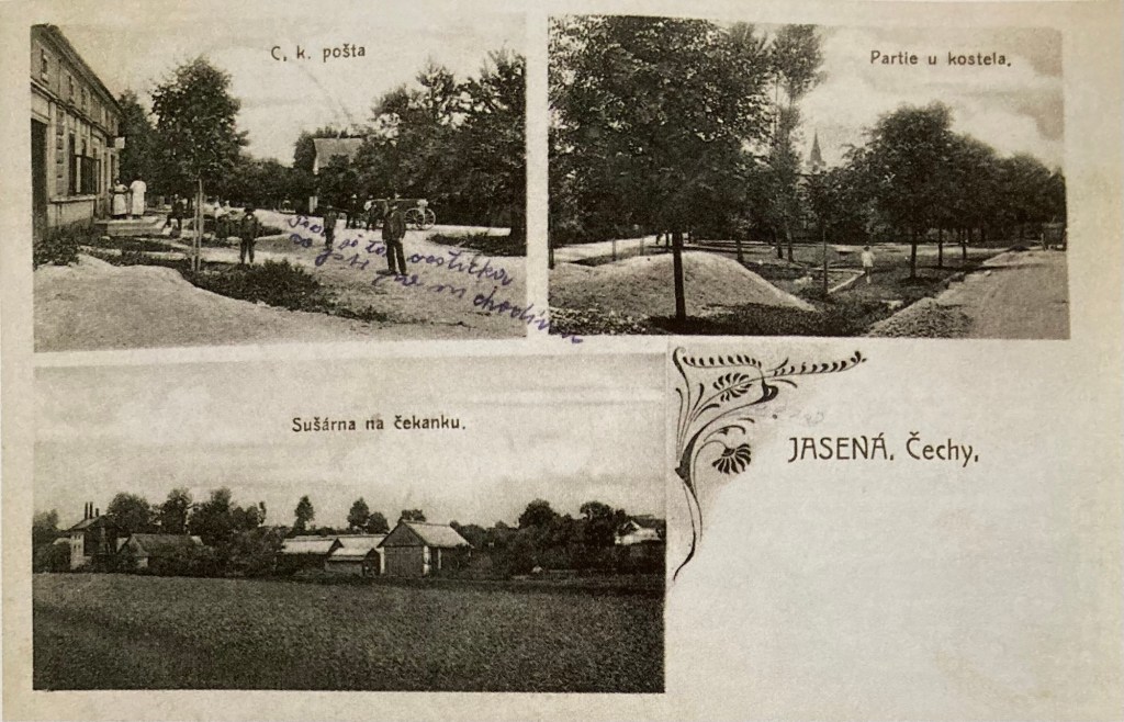 Pohlednice vydaná dne 18. 1. 1915 nákladem Ladislava Hubeného zobrazuje Jasennou, partii u školy a sušárnu na čekanku. Na první pohled nepřipomíná školní libosad, nýbrž chybně upozorňuje na partii u kostela. Popisek je na první pohled matoucí, ale při bližším prozkoumání bystrému oku neunikne zděná nádrž rybníčku, do kterého s přepadem přitéká Jasenský potok.