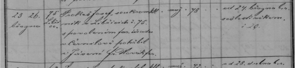 Josef přišel na svět 26. ledna v Jasenné, v domě číslo 14. Byl pokřtěn o den později a jeho tatínek, Jan Prokeš, se živil jako krejčí. Tento zápis najdeme v matrice narozených, která uchovává vzpomínku na jeho první dny života. Jasenský občan a soukromník Josef Prokeš založil v roce 1886 nadaci ve výši 1000 zl. Z té byli každoročně v den sv. Mikuláše obdarováváni oděvem, obuví a školními potřebami „chudí, mravní a pilní žáci, kteří školu v Jasenné s dobrým prospěchem pilně navštěvují“. Josef zemřel 26. března 1890 ve svém domě v Libřicích, číslo popisné 75. Podle zápisu v matrice zemřel stářím a pochován byl na jasenském hřbitově.