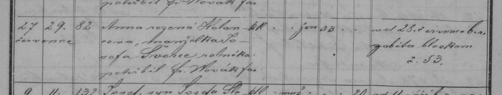 Anna, rozená Holancová v roce 1853, manželka Josefa Švorce (čp. 82), tragicky zemřela ve věku 33 let po zásahu bleskem dne 28. července 1886 v blízkosti domu čp. 53. Na její poslední cestě ji doprovázel farář František Novák.